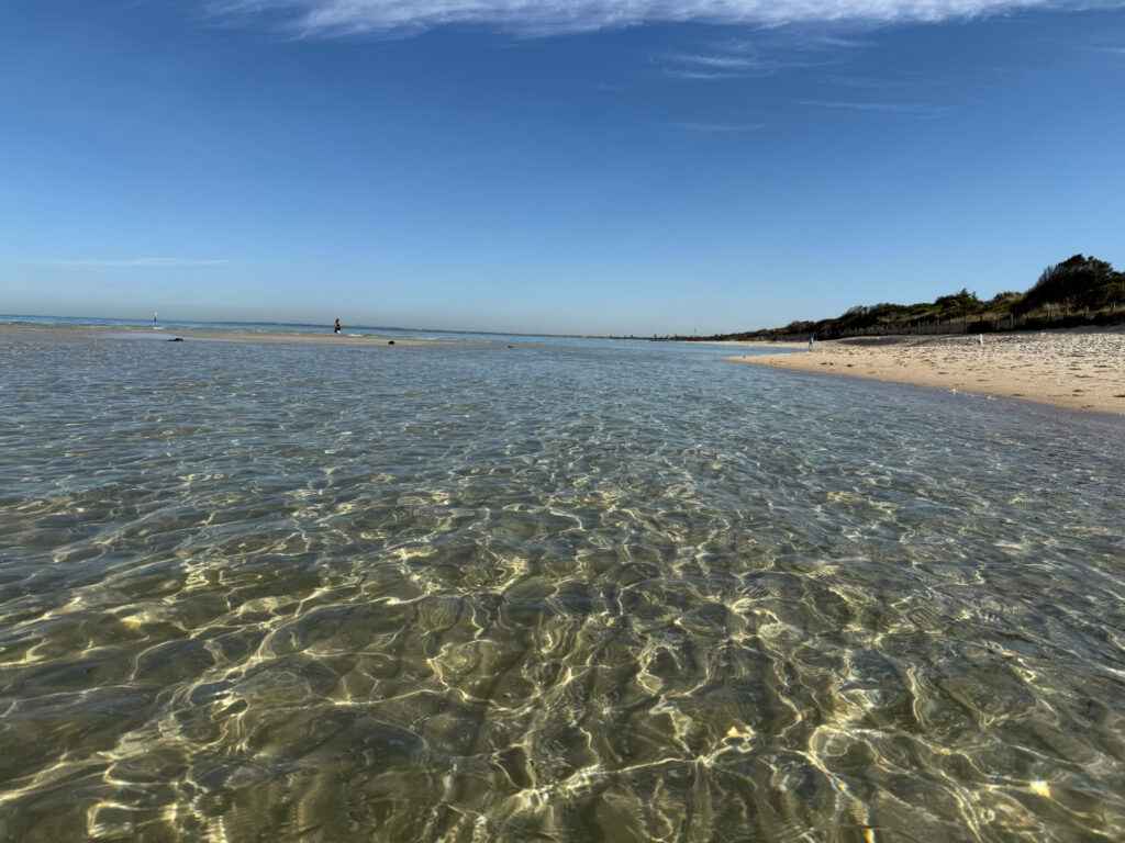 浅瀬でくるぶしまで水に浸かると、緊張していた体がふっと緩みます。